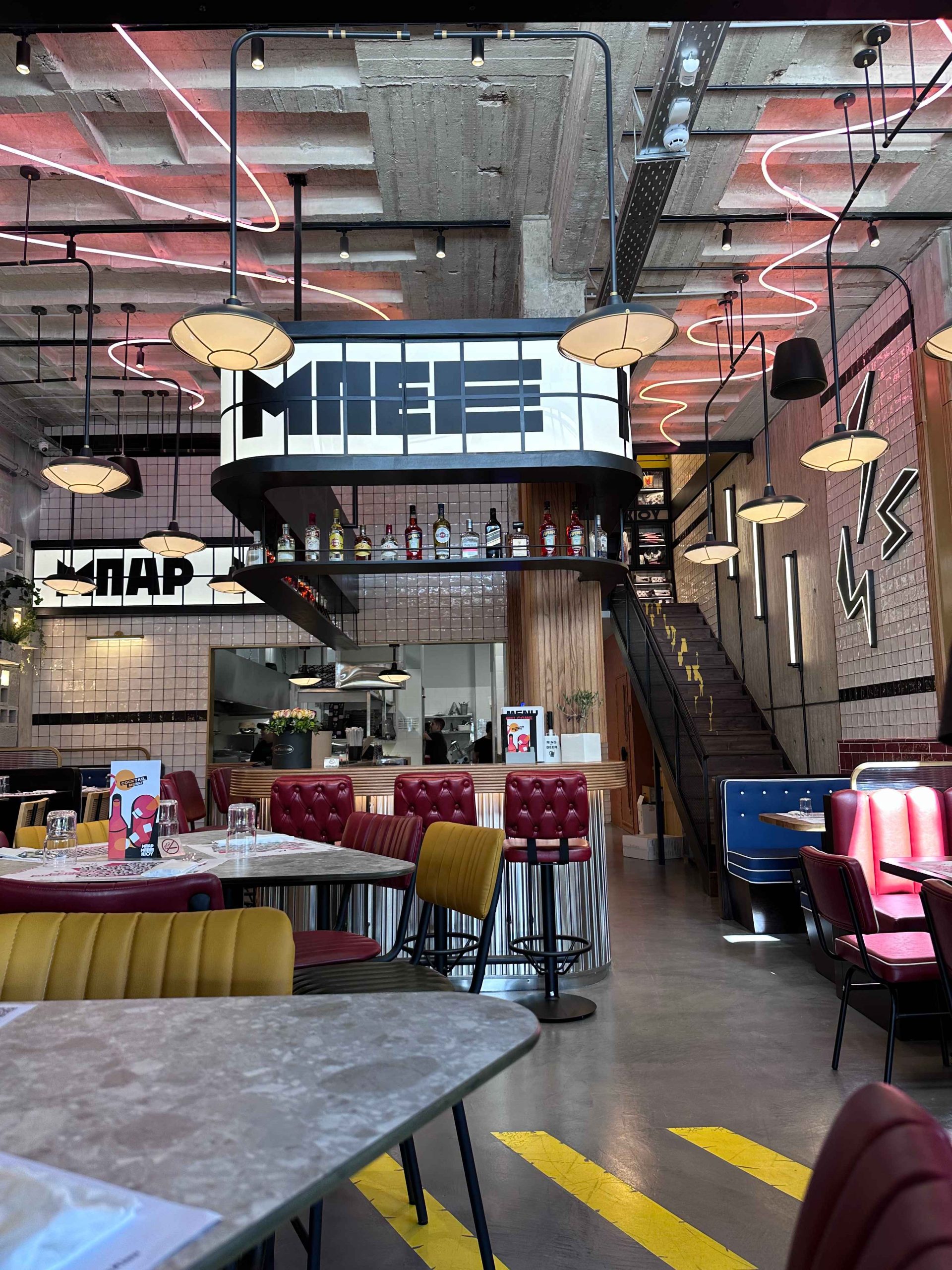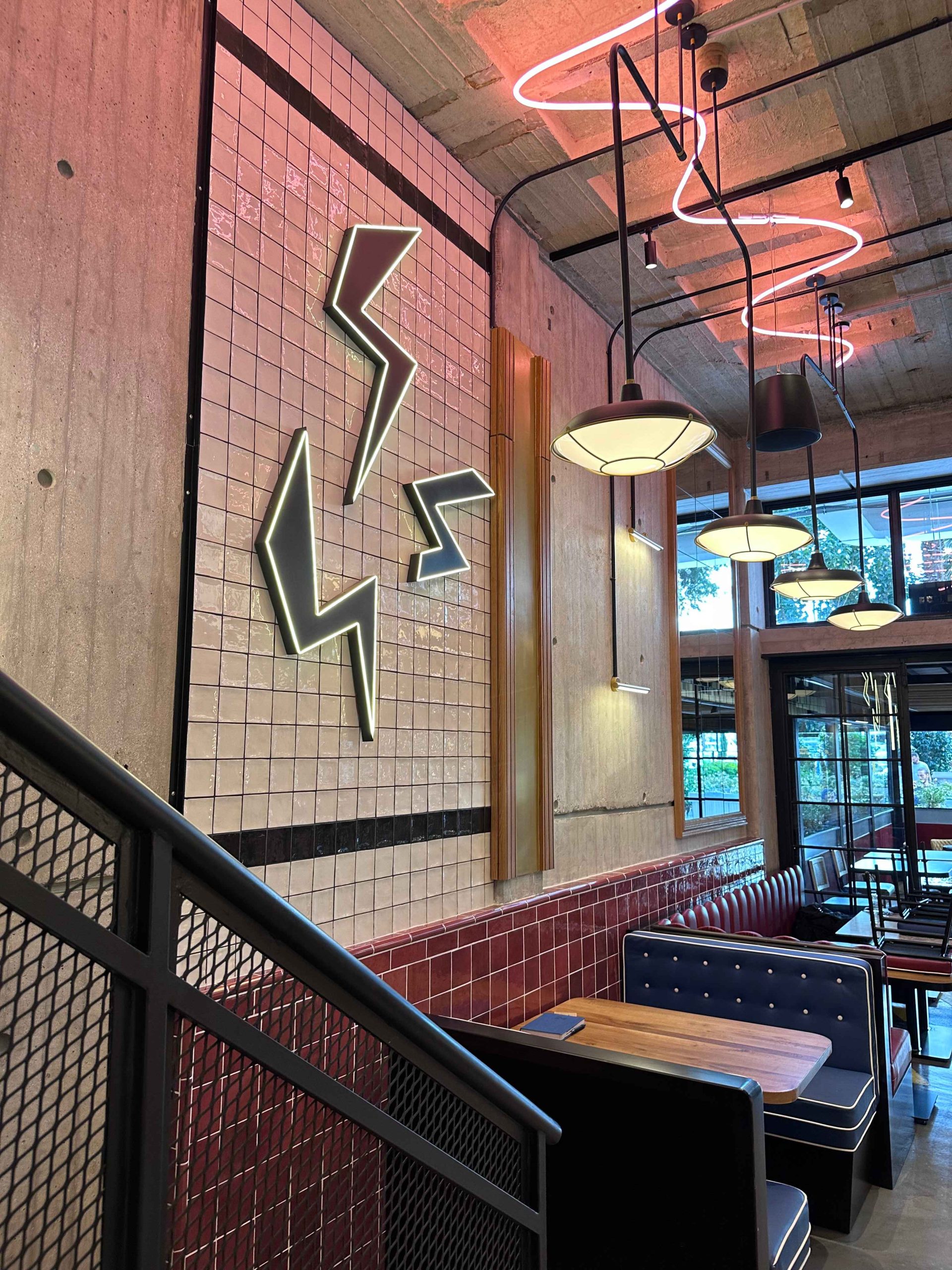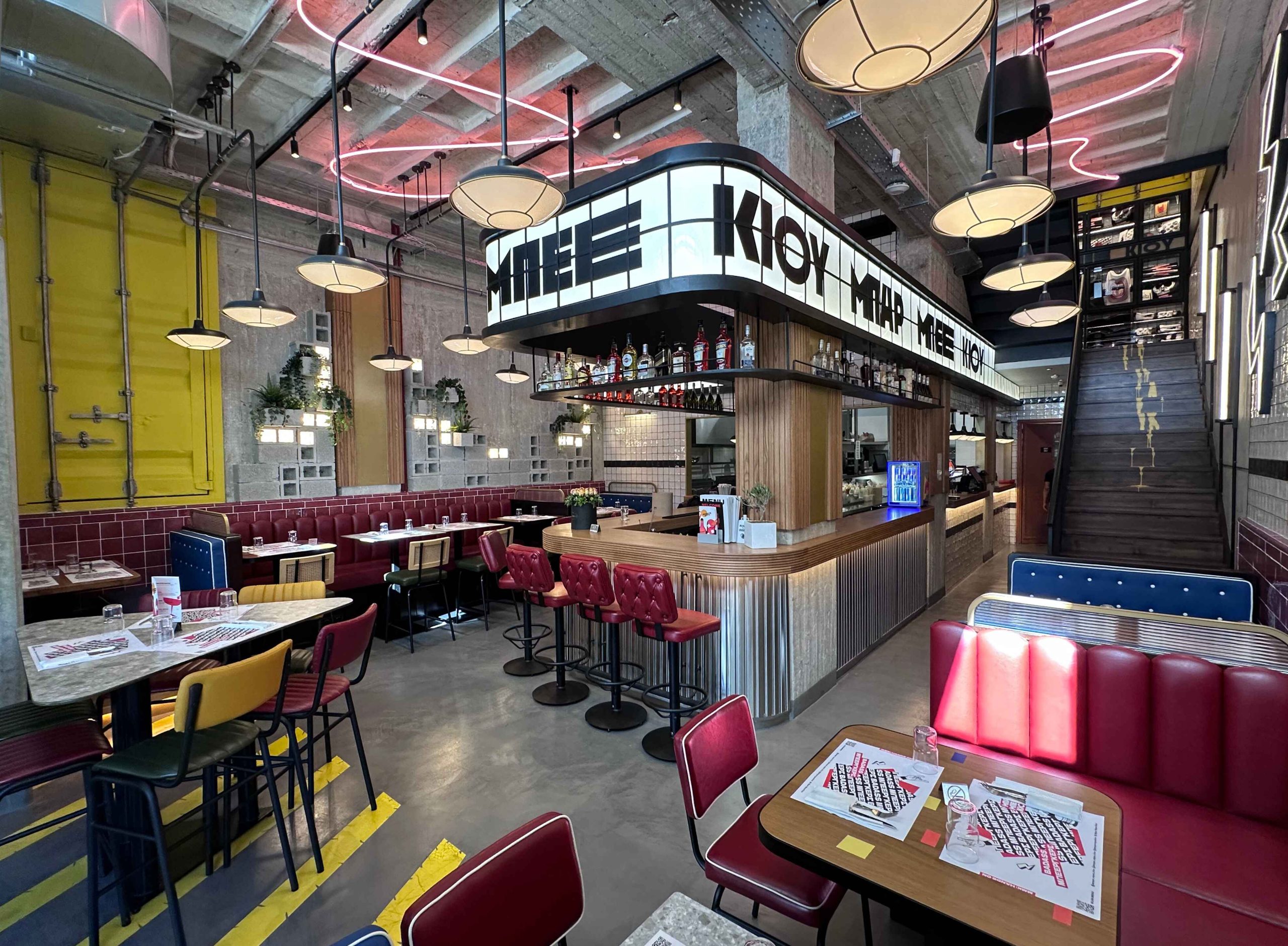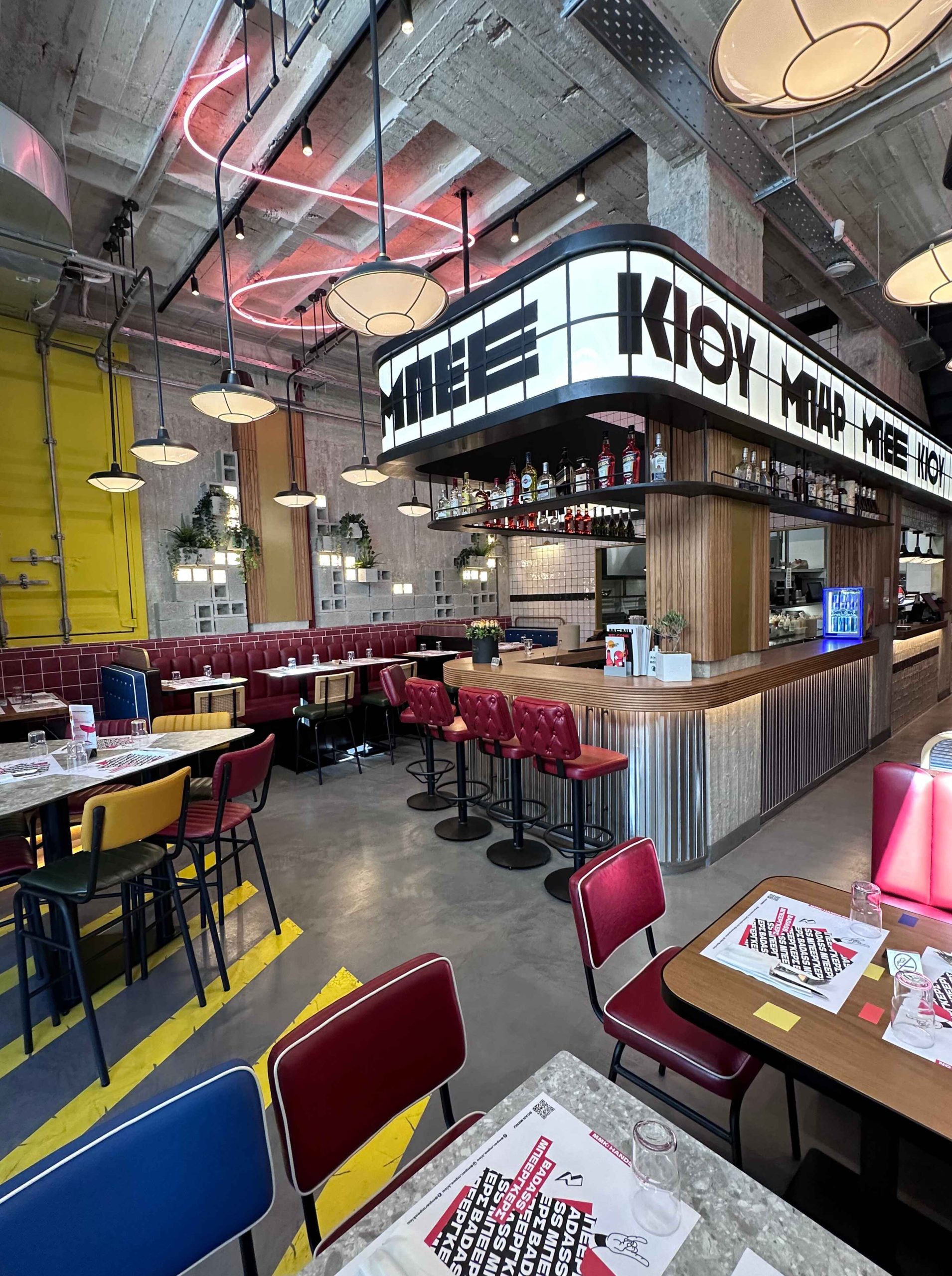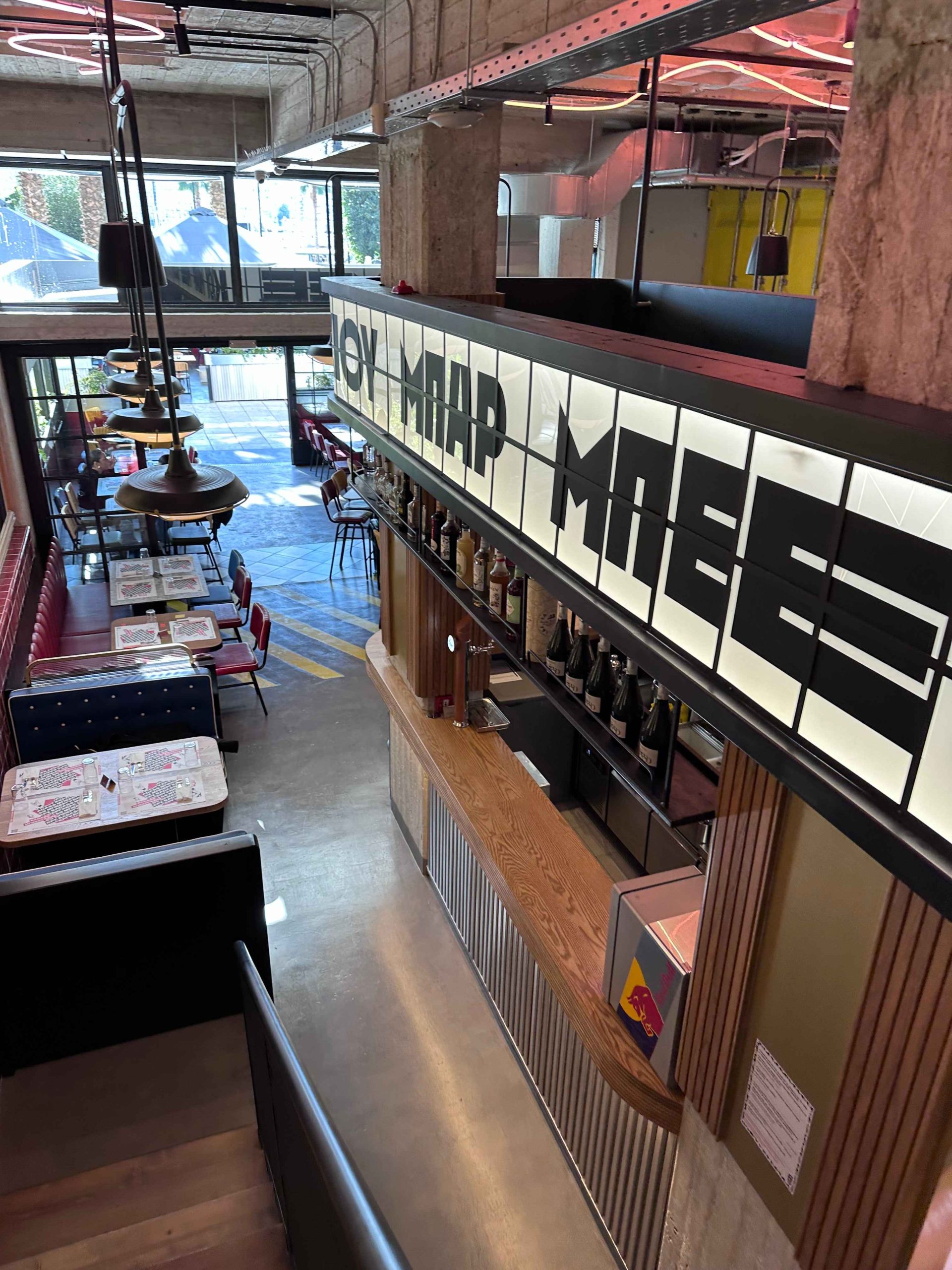 Η κουζίνα ακολουθεί την φιλοσοφία της ανοικτής κουζίνας ενώ ένα επιβλητικό κεντρικό μπαρ έχει σχεδιαστεί στο κέντρο του καταστήματος σε μια προσπάθεια δημιουργίας ενός ζωτικού πυρήνα στο κέντρο.