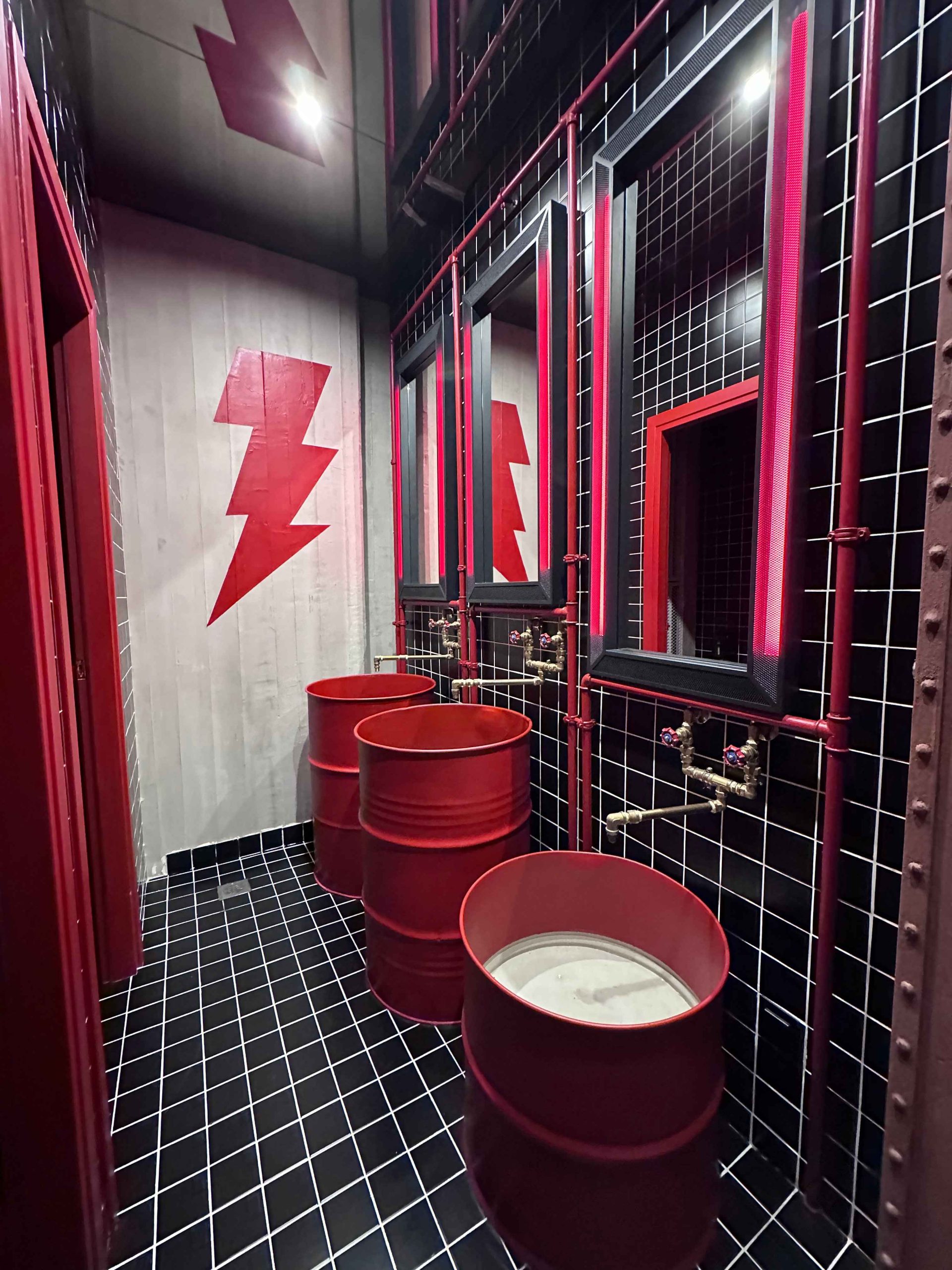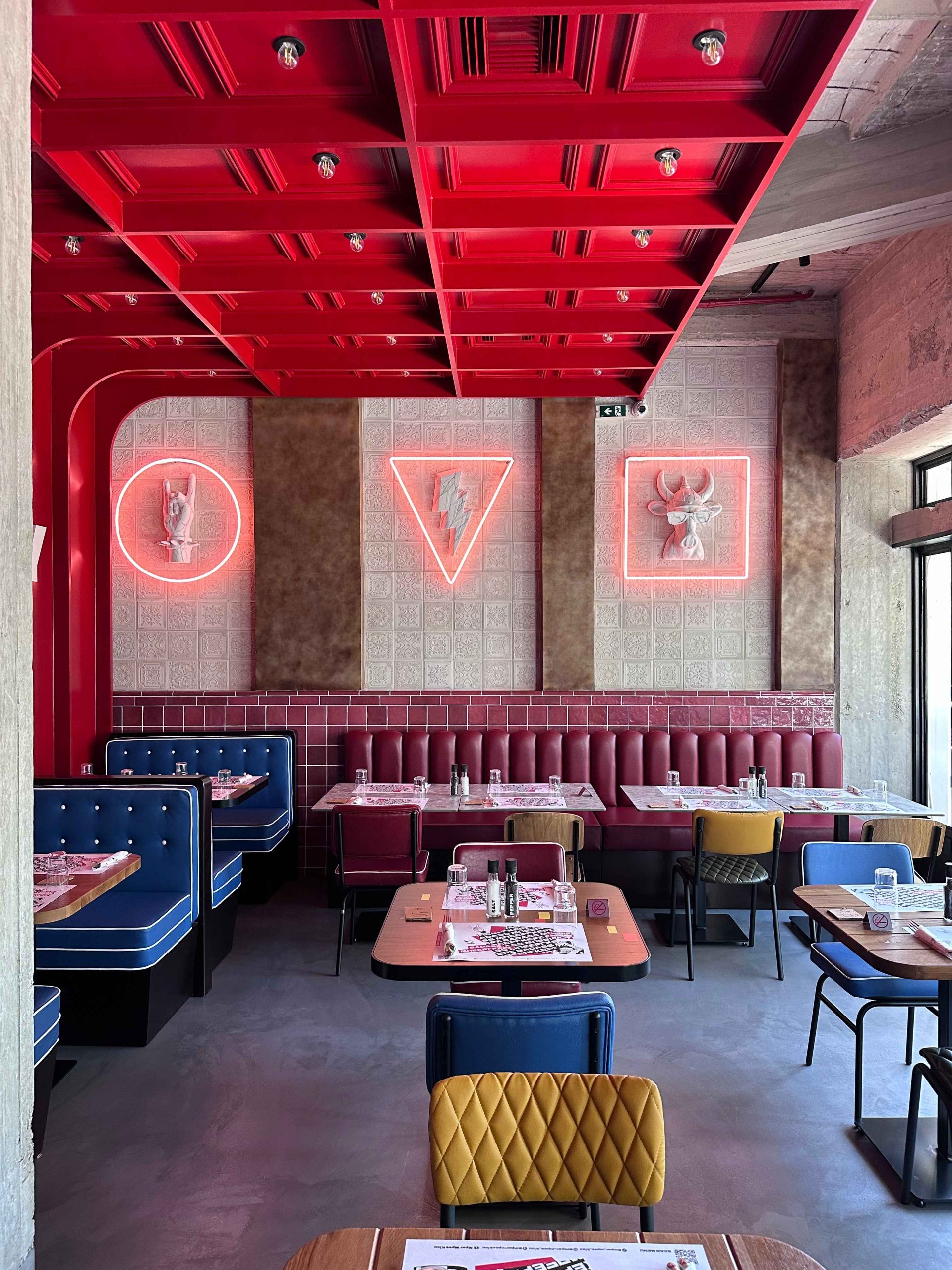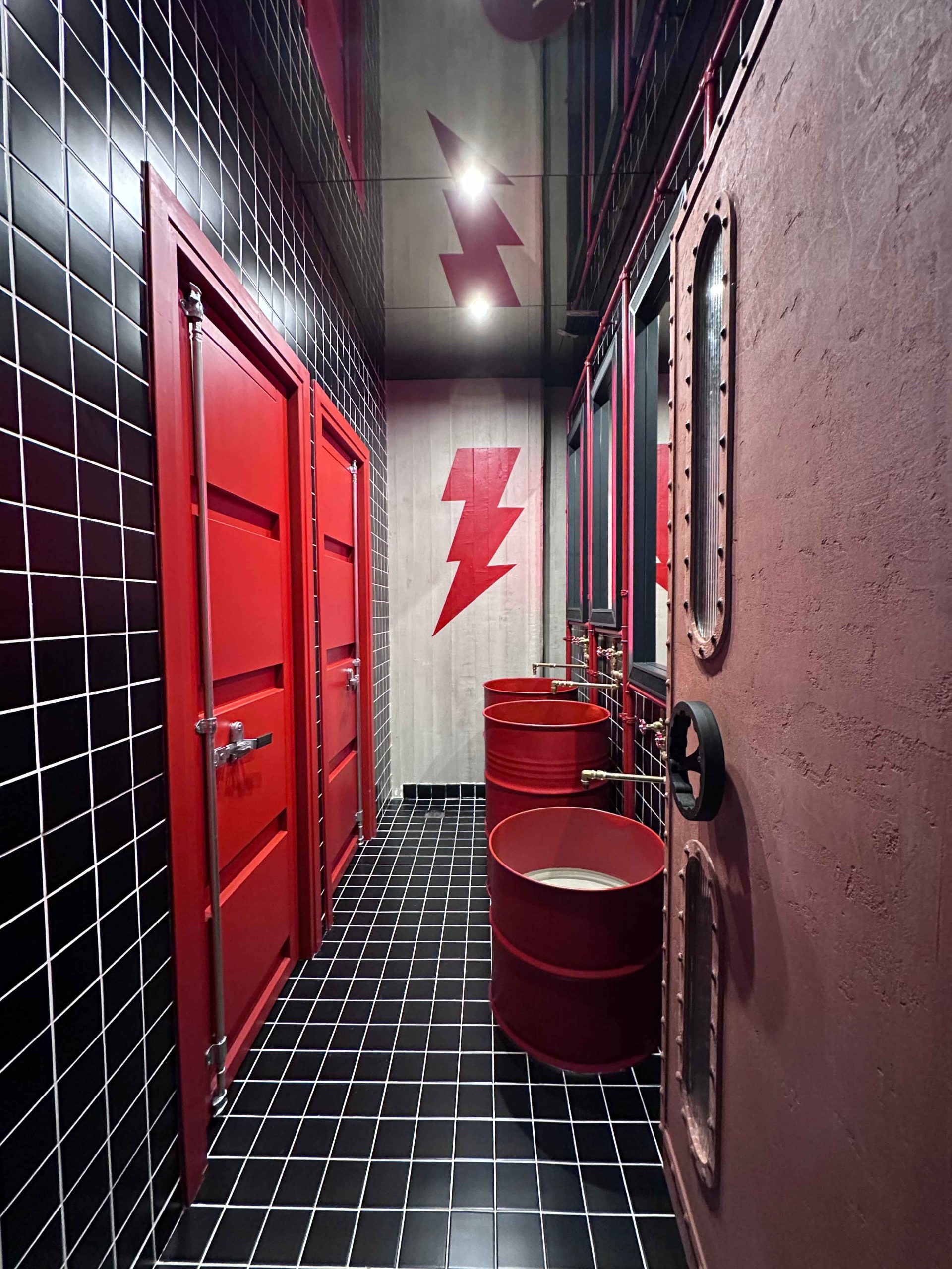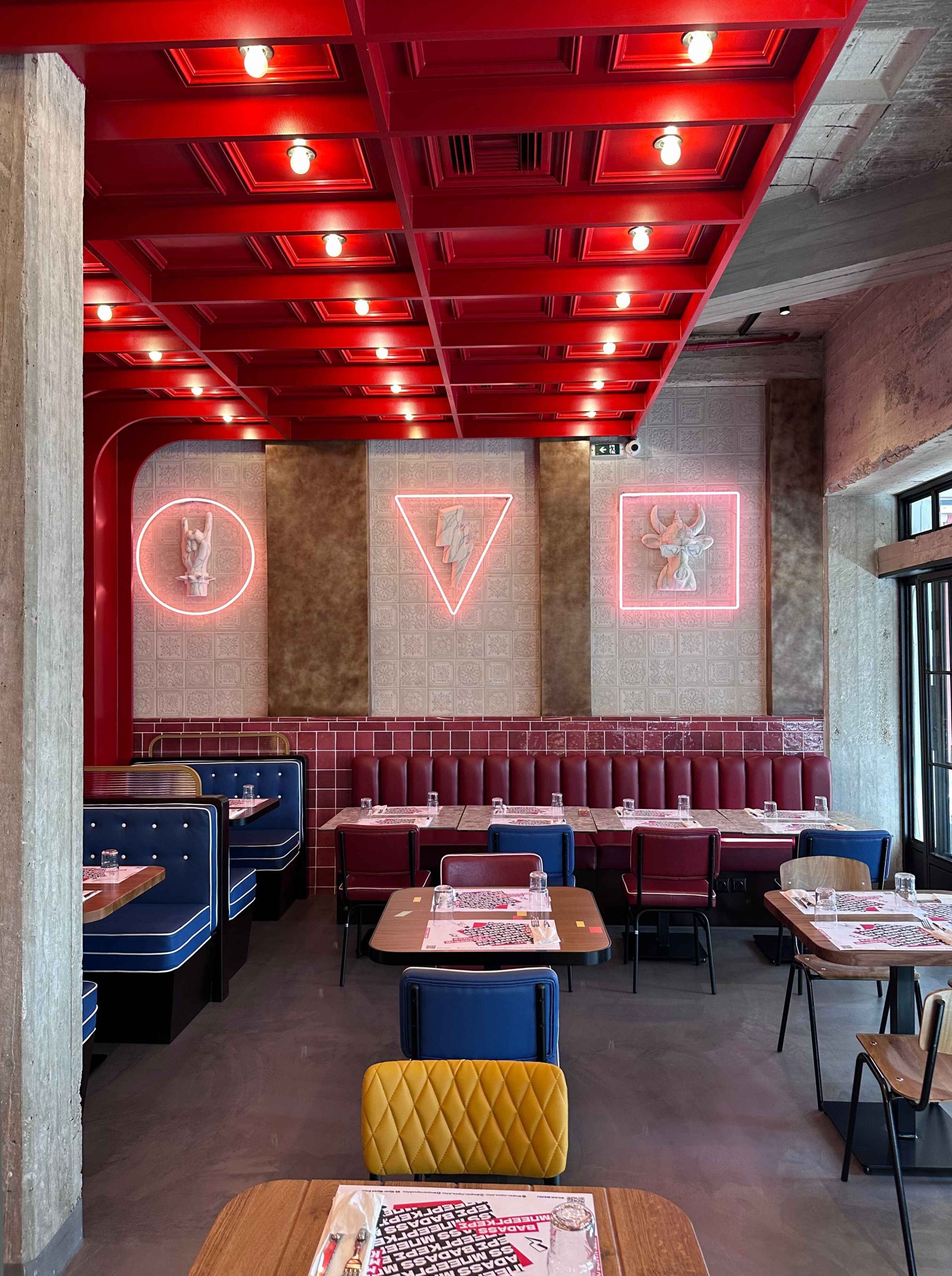 Το κατάστημα αποτελείται από δύο ορόφους. Στον δεύτερο όροφο έχει επιλεχθεί μία πιο εξεζητημένη αισθητική με μία κόκκινη γυαλιστερή επένδυση οροφής και τοίχου.