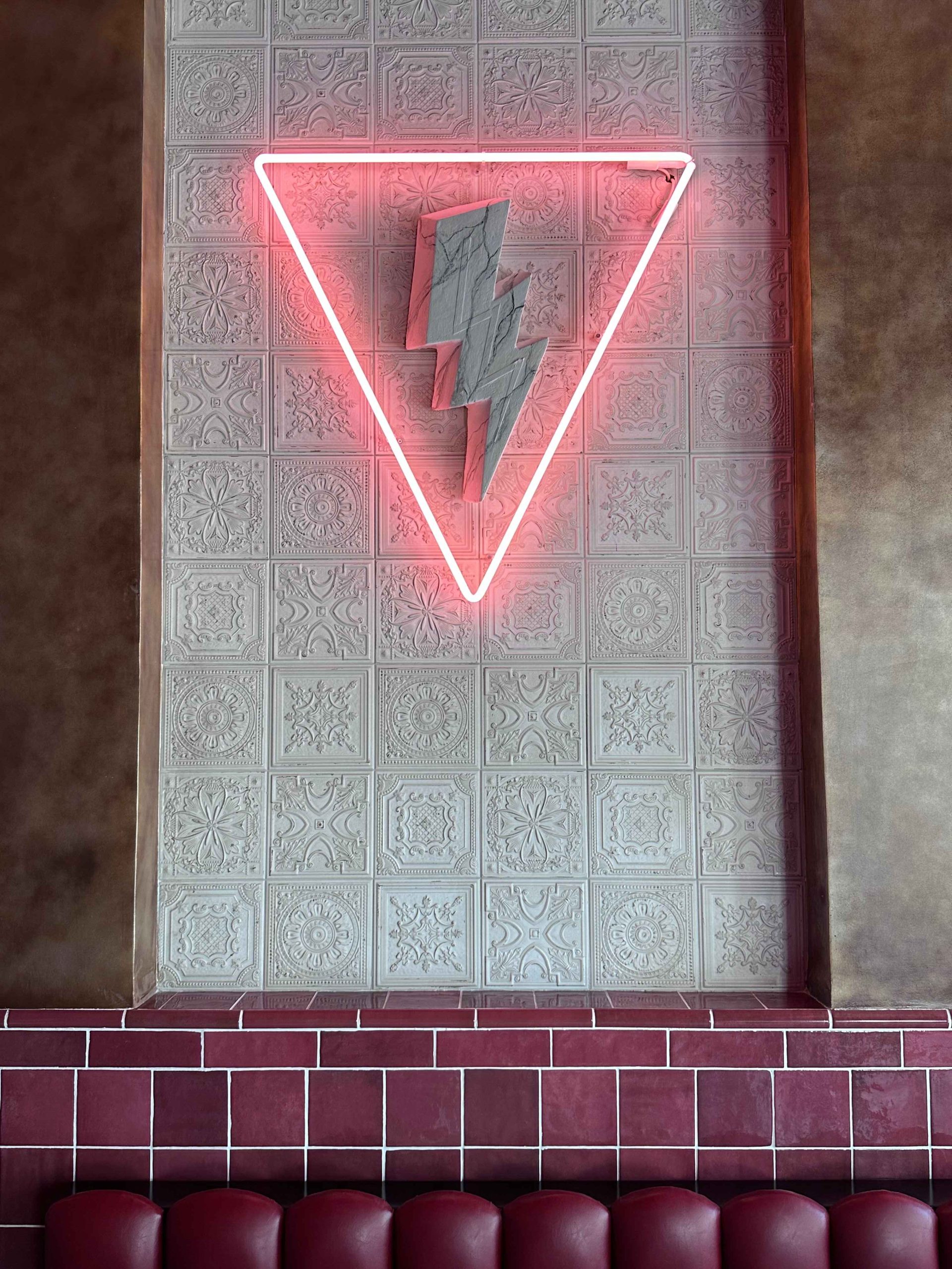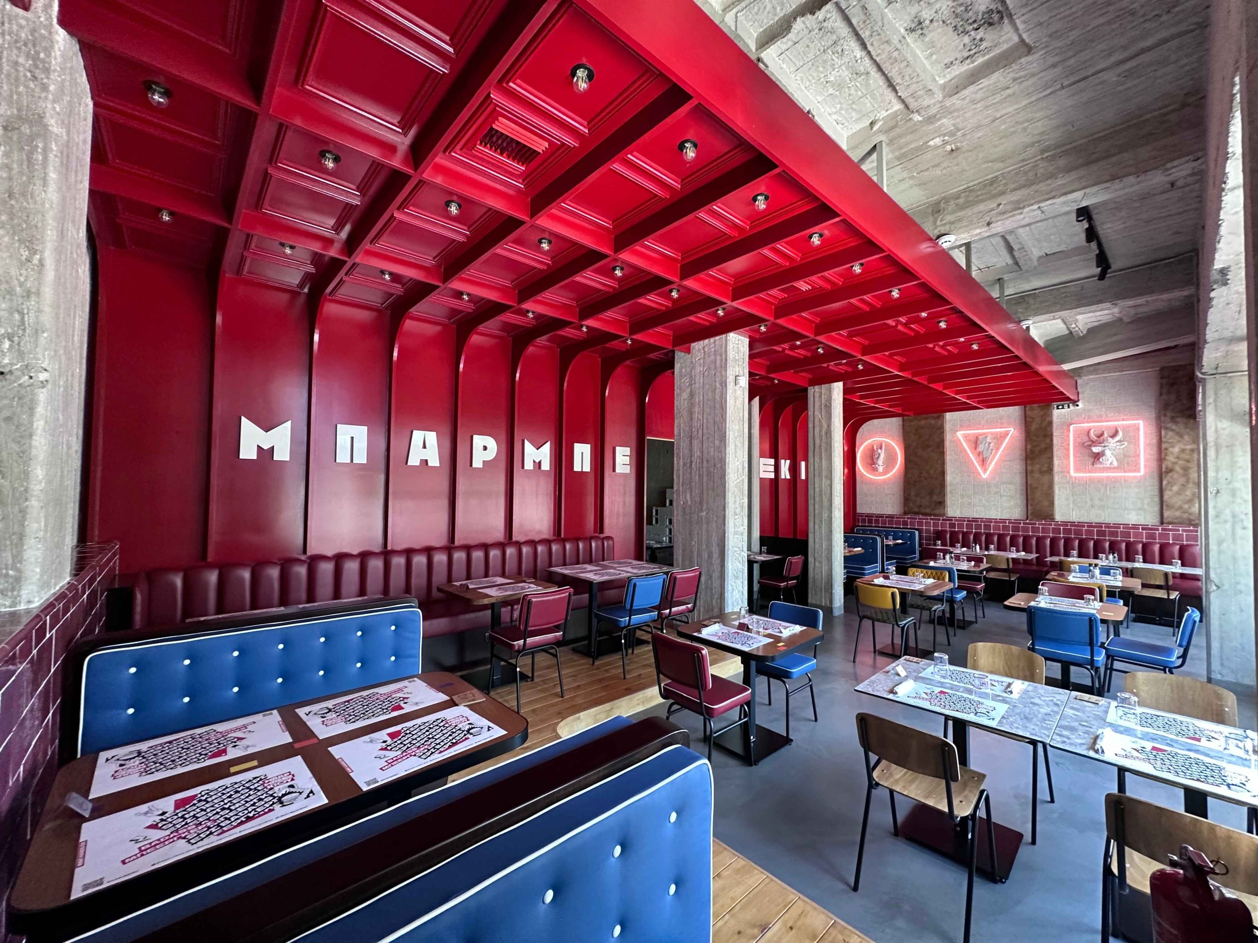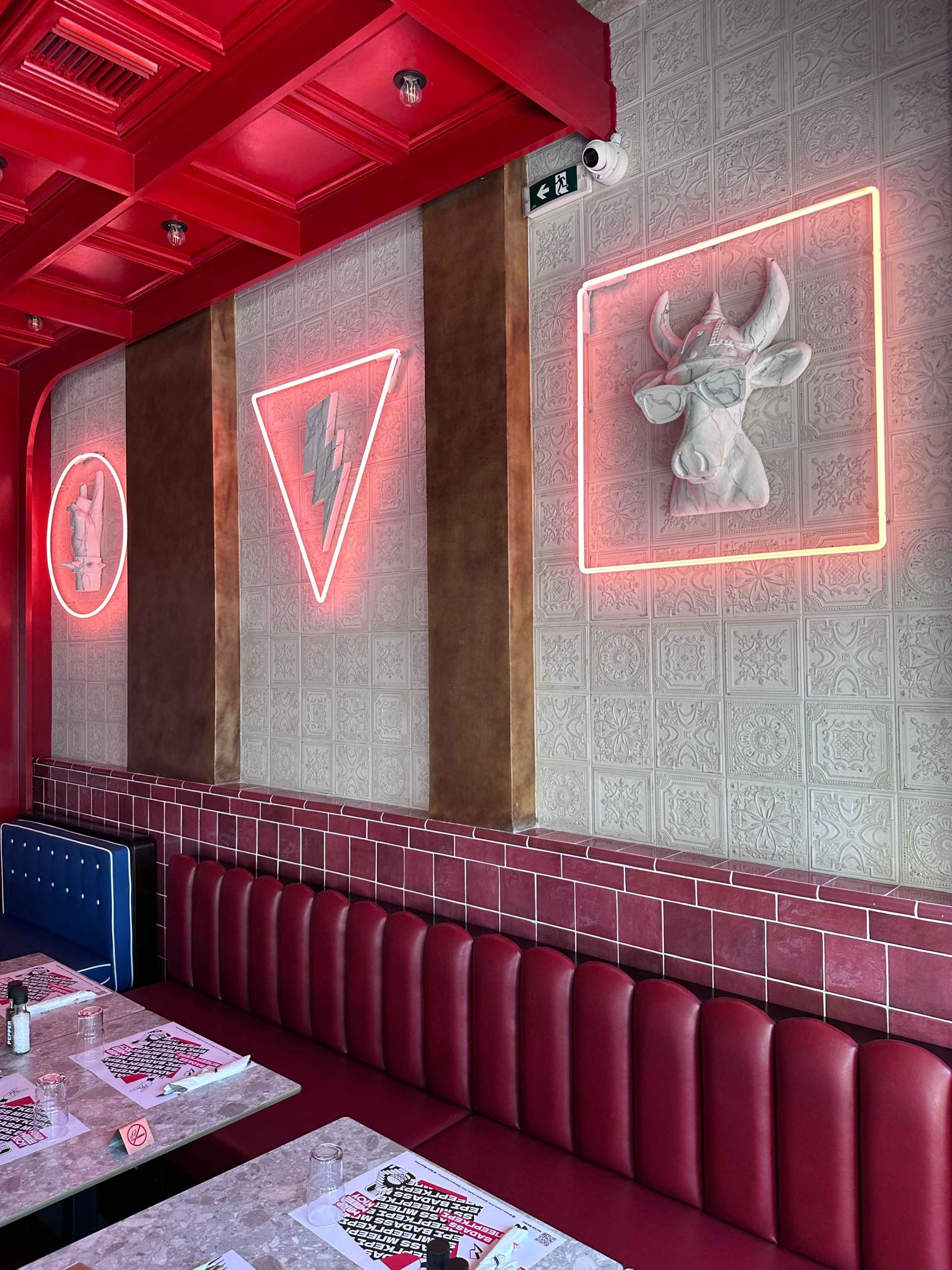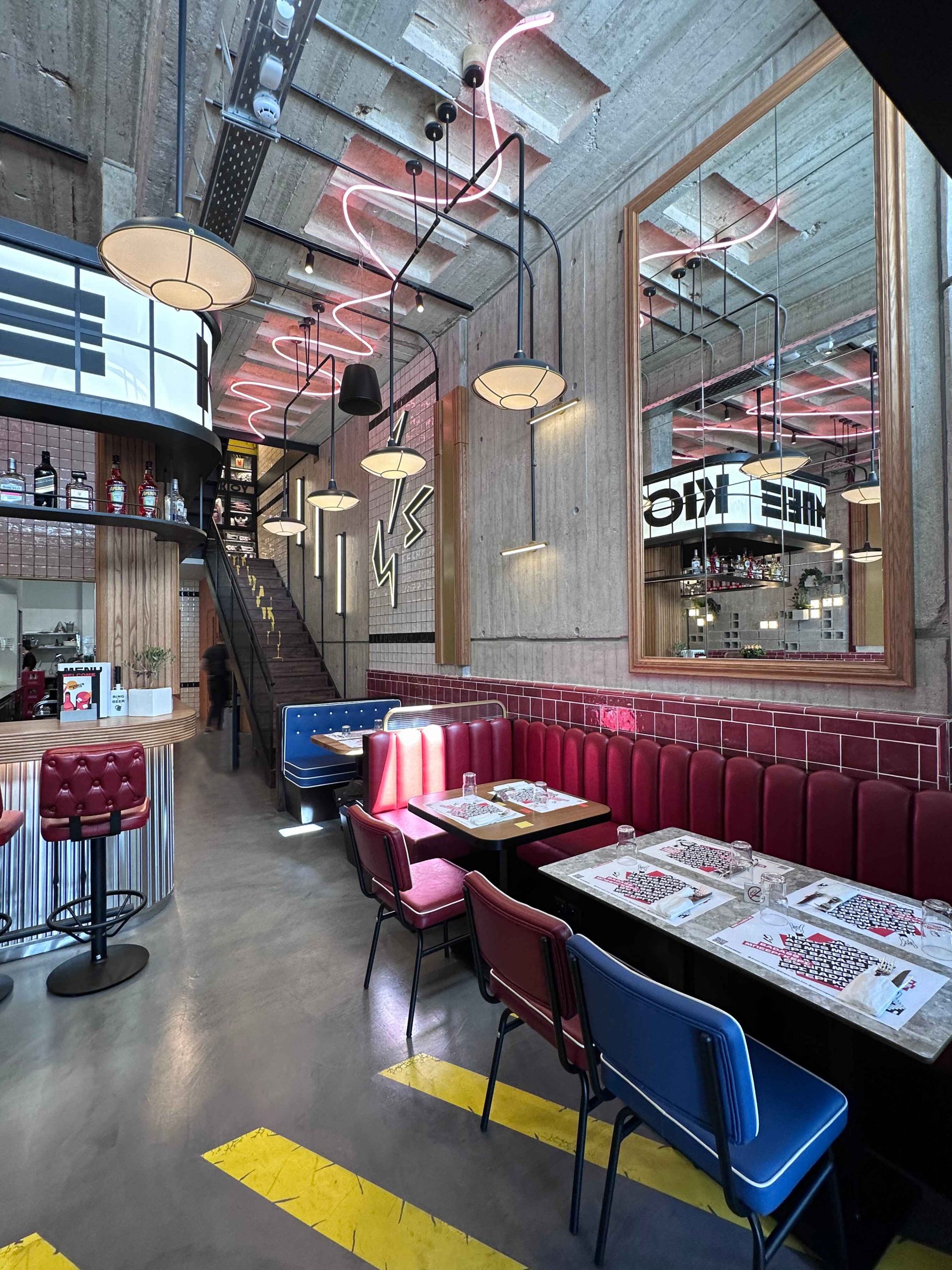 Το κατάστημα αποτελείται από δύο ορόφους. Στον δεύτερο όροφο έχει επιλεχθεί μία πιο εξεζητημένη αισθητική με μία κόκκινη γυαλιστερή επένδυση οροφής και τοίχου.