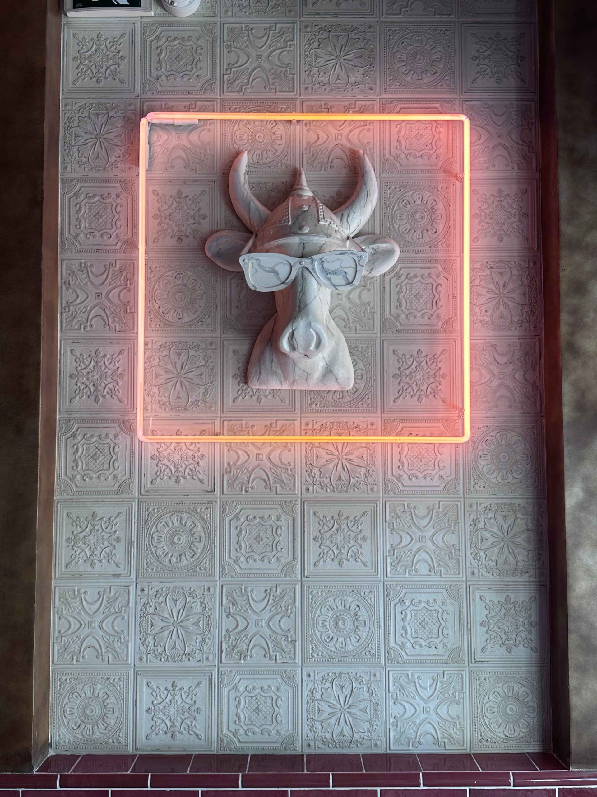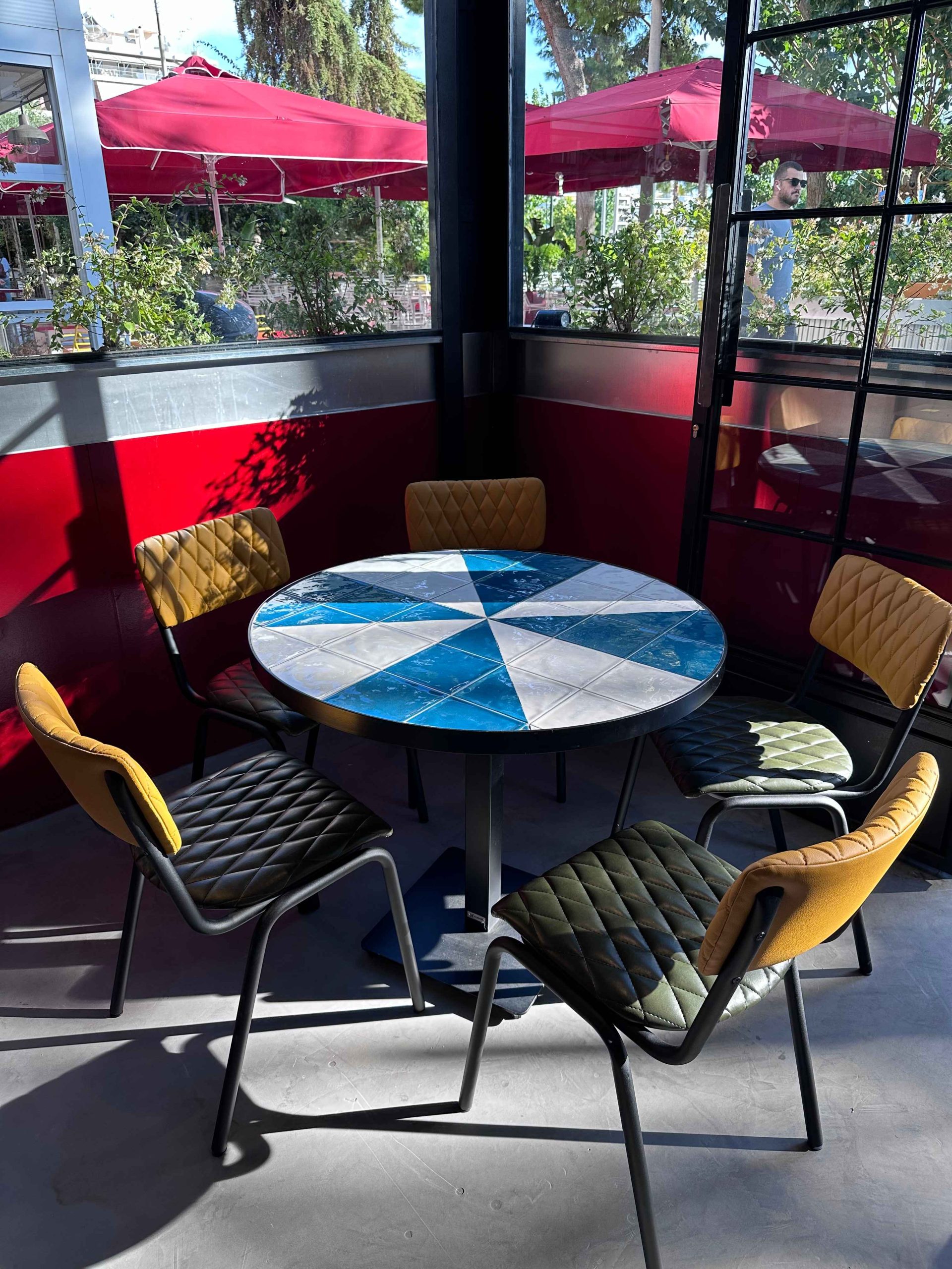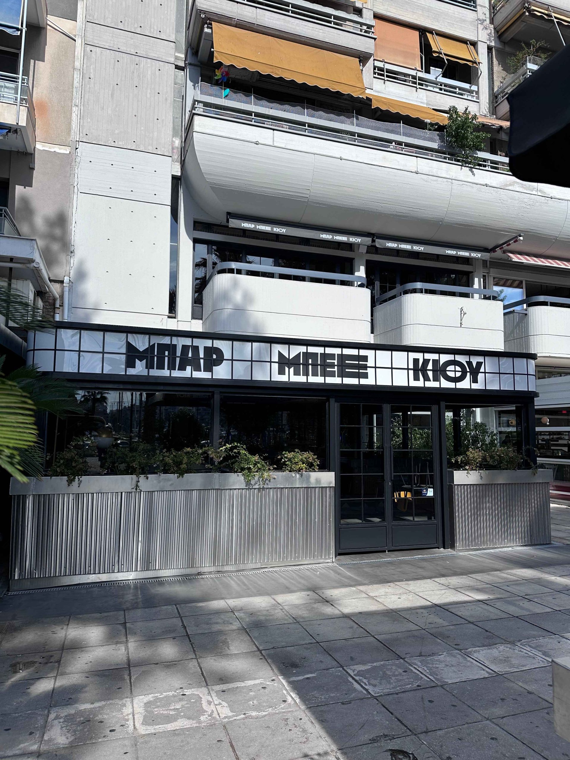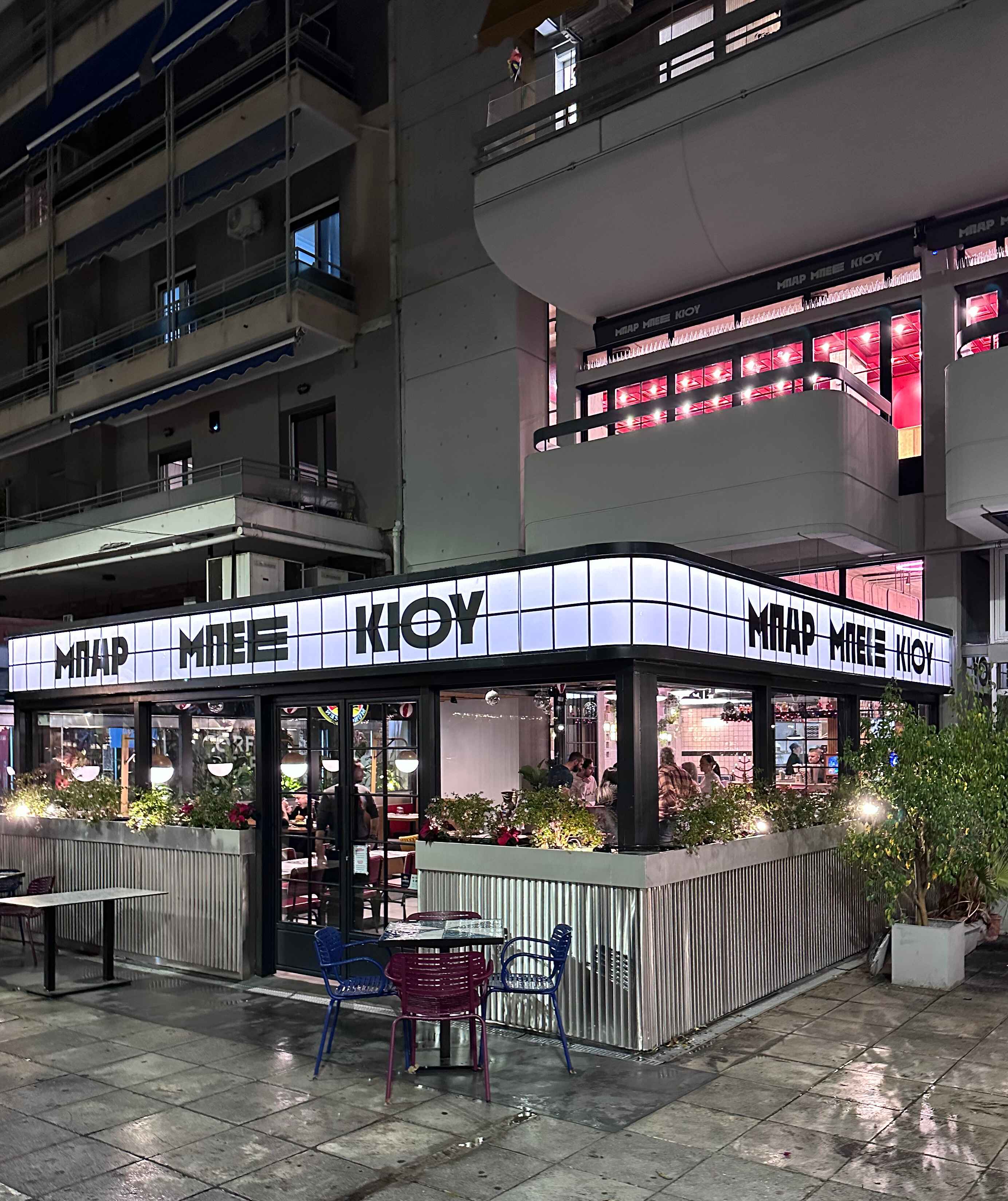 Στον εξωτερικό χώρο δεσπόζει μία μεταλλική κατασκευή με Φωτεινή επιγραφή το λογότυπο του καταστήματος ενώ το κάτω μέρος της βάσης του έχει κατασκευαστεί από ανοξείδωτα μέταλλα μια μεταλλική ζαρντιέρα προσδίδοντας μία street αισθητική στον αύλειο χώρο του.