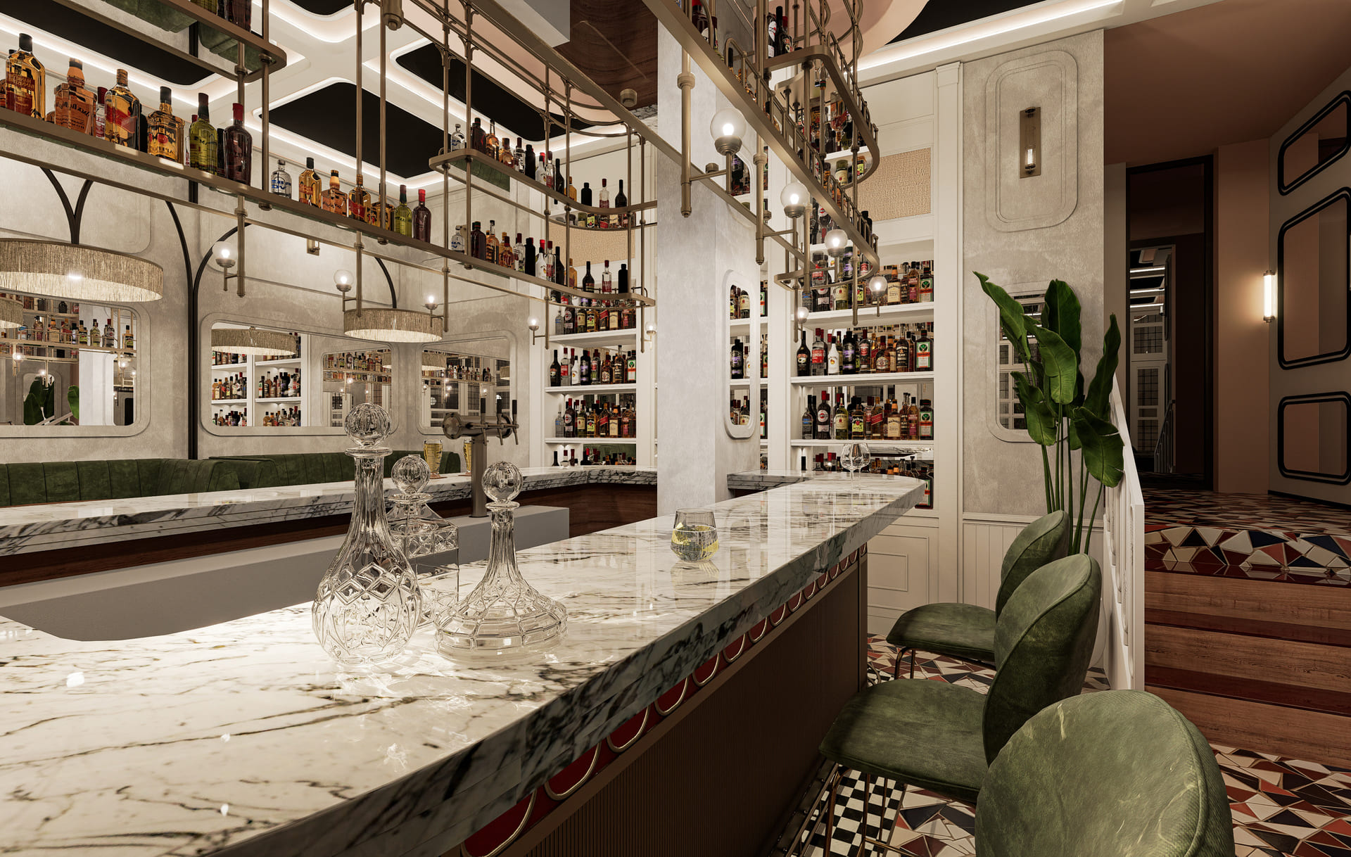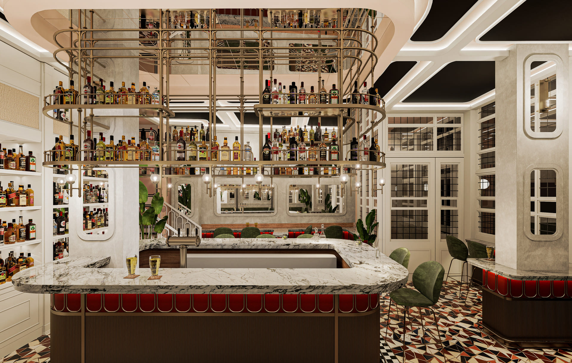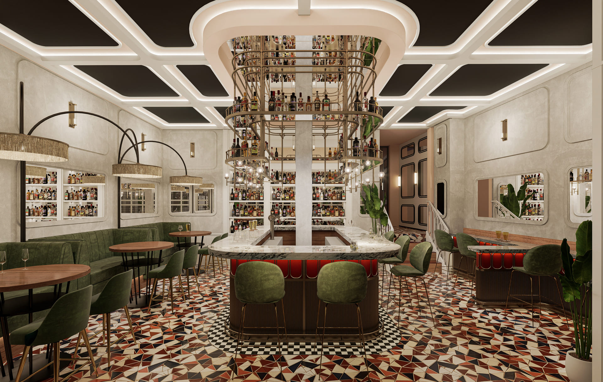 An evening aesthetic was chosen with bold surfaces both on the floor and on the walls and ceilings of the store. A central bar has been placed in the center of the store creating a core of gathering people. A suspended metal structure has been designed above the bar in which bottles and glasses will be placed.