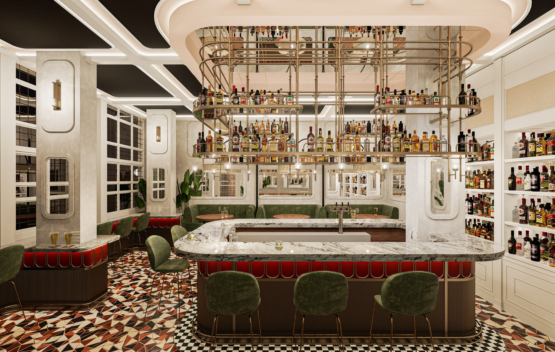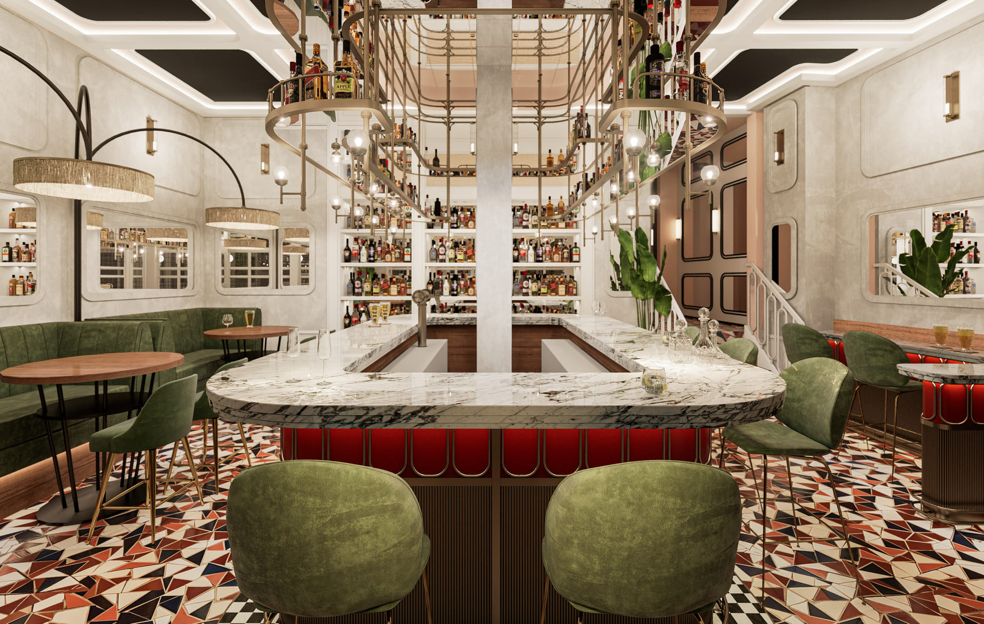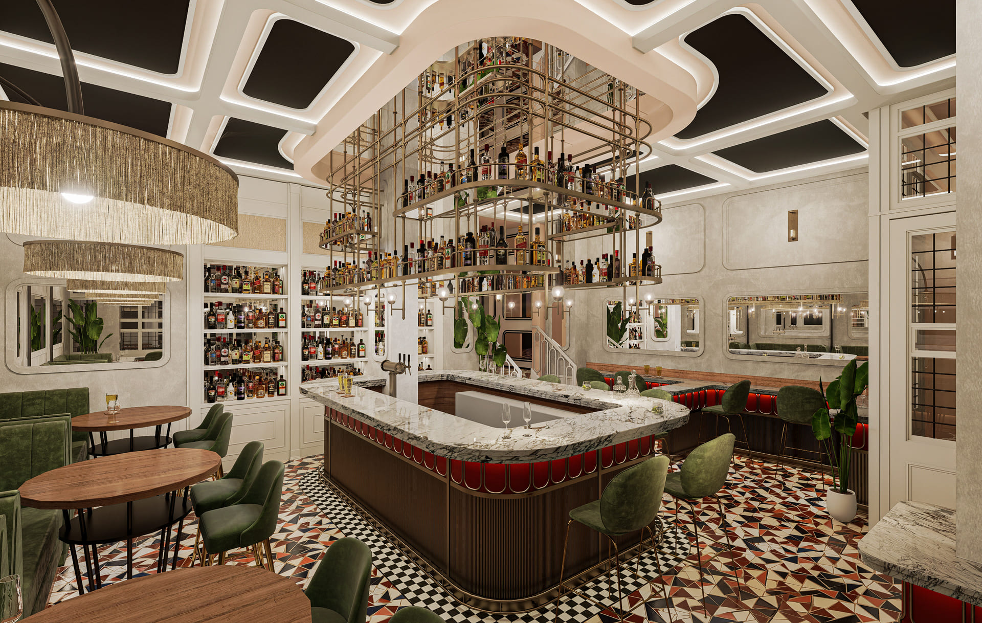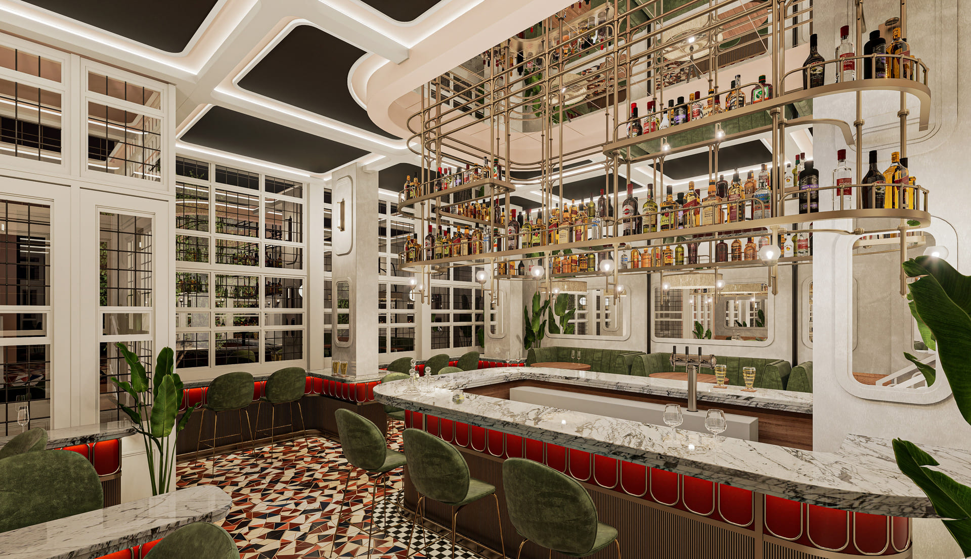 An evening aesthetic was chosen with bold surfaces both on the floor and on the walls and ceilings of the store. A central bar has been placed in the center of the store creating a core of gathering people. A suspended metal structure has been designed above the bar in which bottles and glasses will be placed.