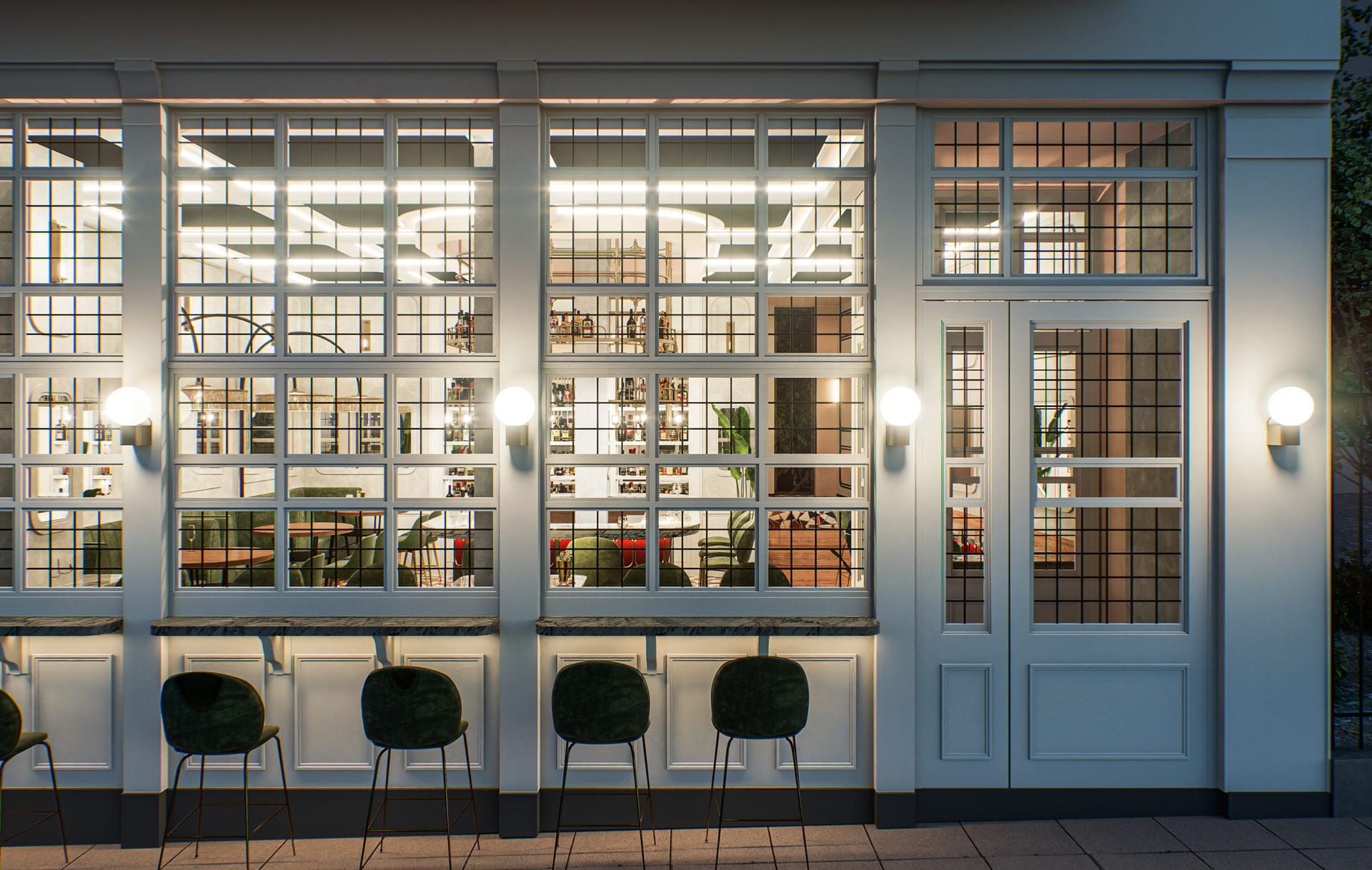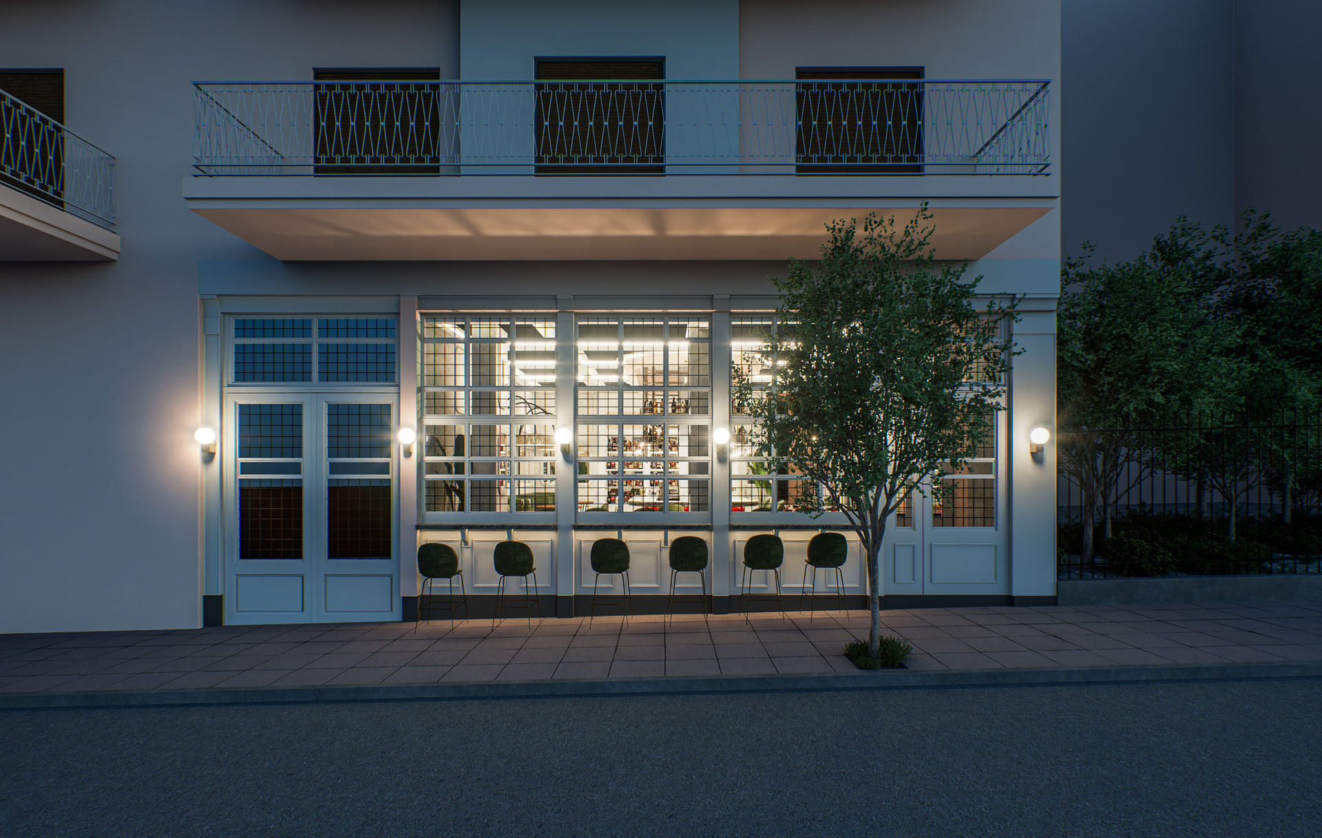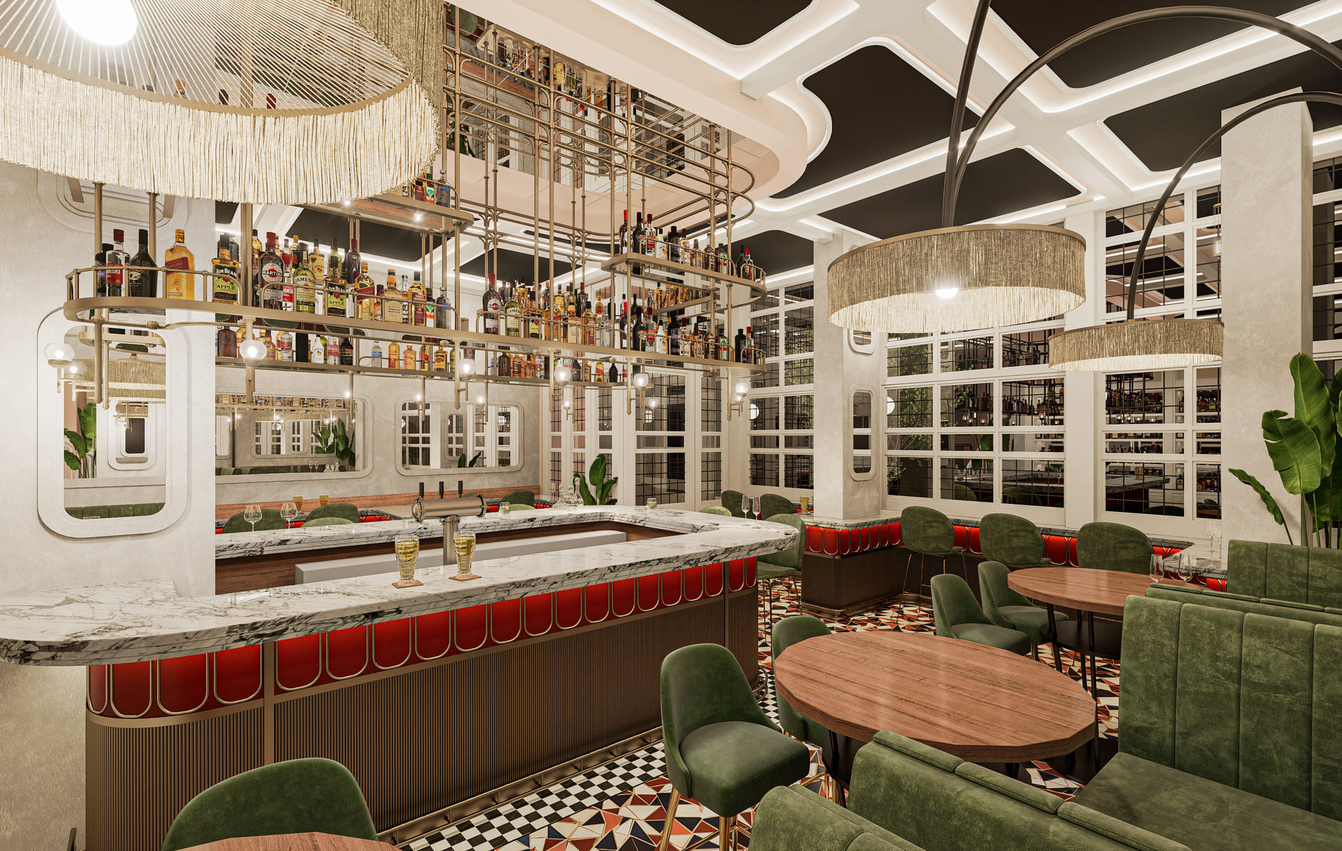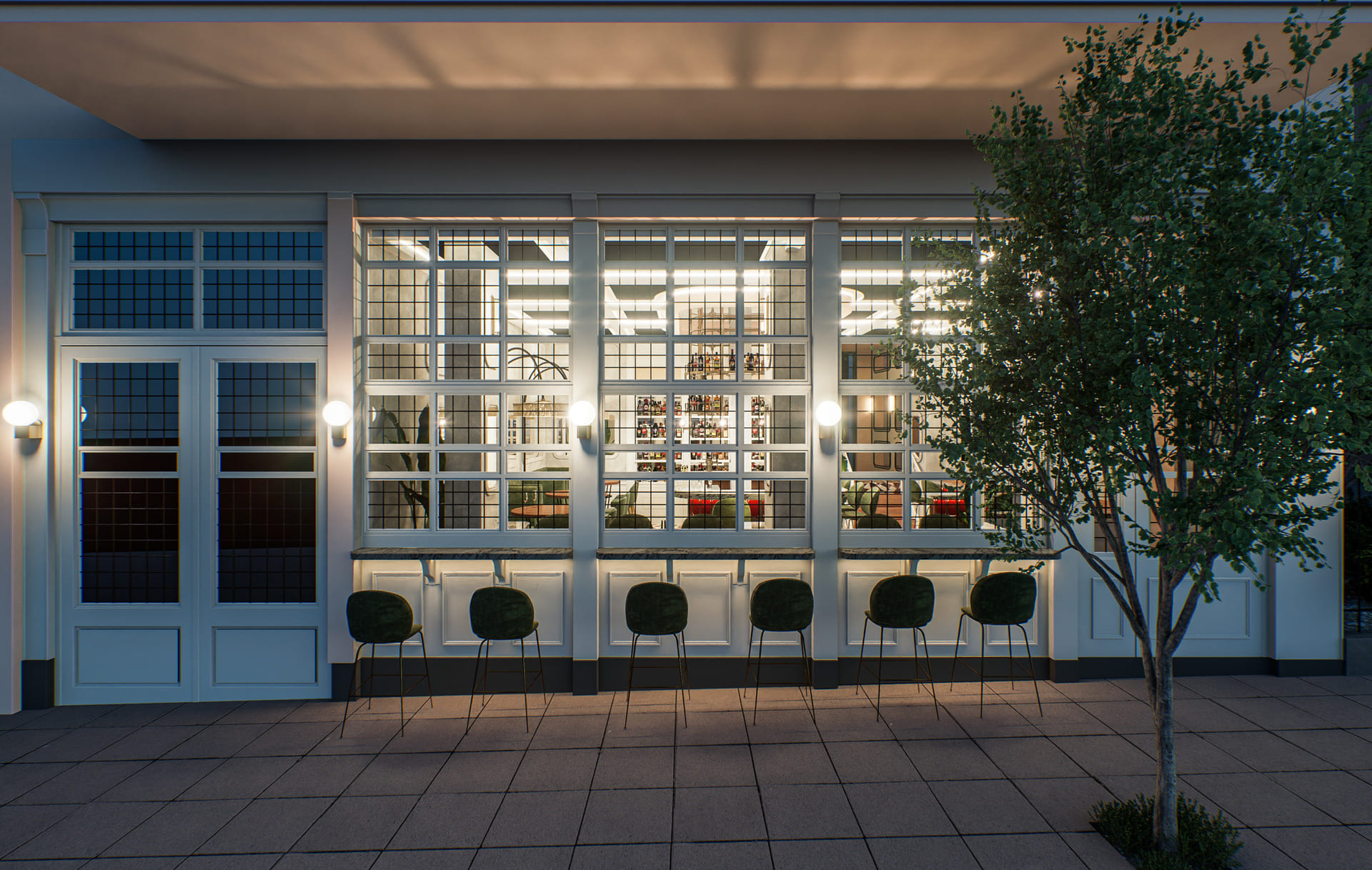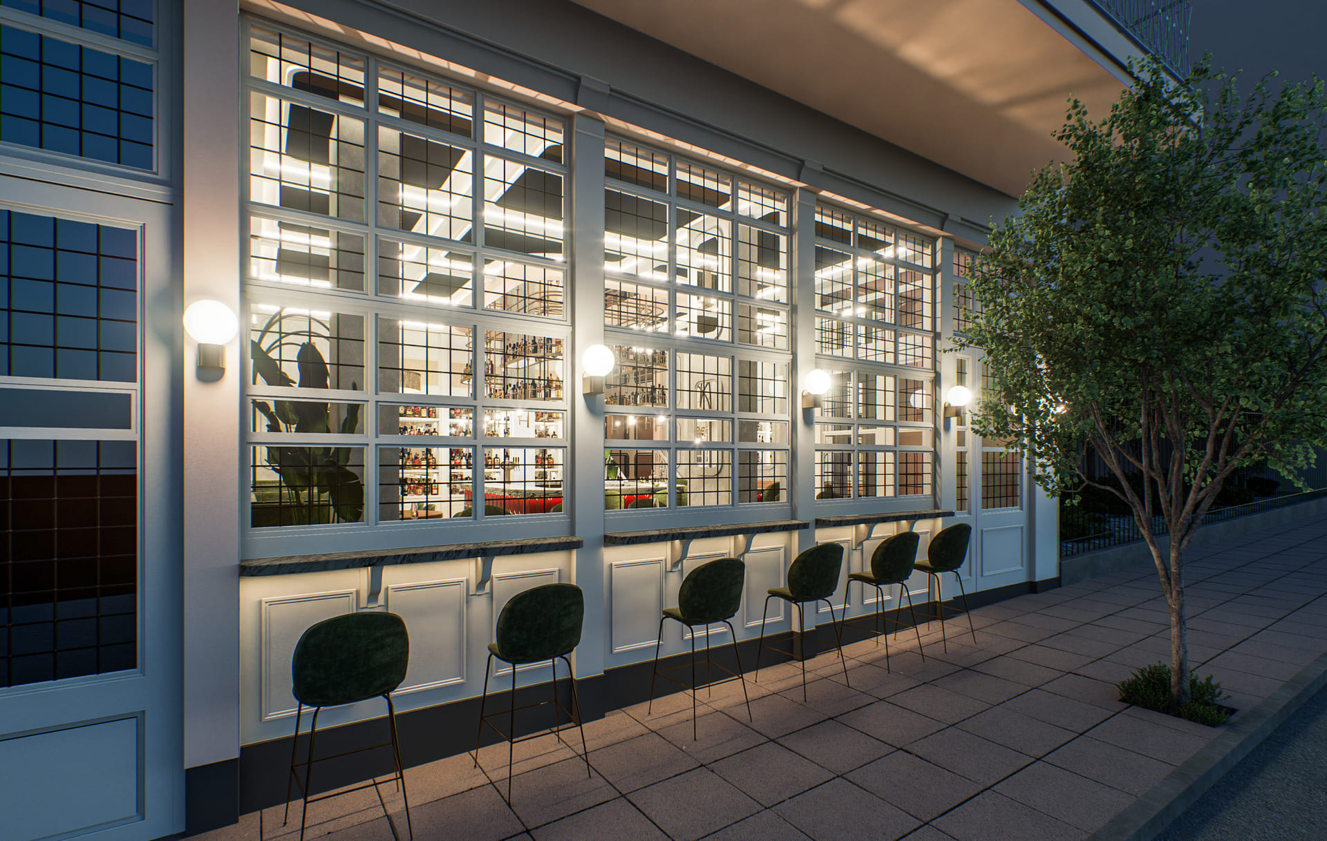 The facade has been designed from scratch and consists of wooden surfaces that create a sense of colonial glamour.