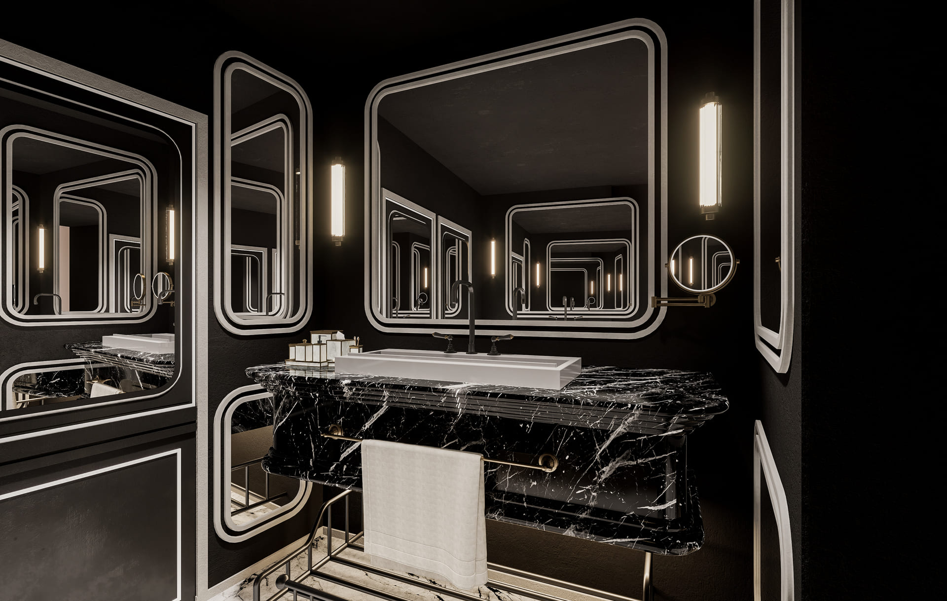 The same shapes of curved surfaces have been used in the toilets with black backgrounds and mirrored surfaces creating multiple levels of reflection.